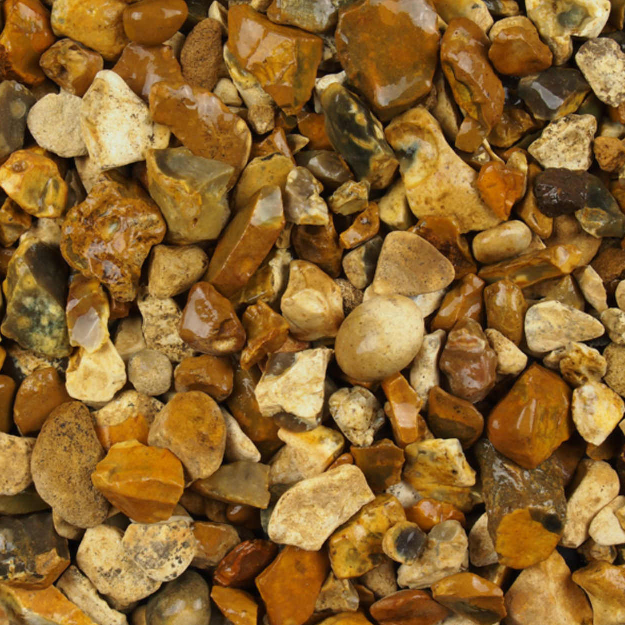 This brightly coloured gravel is very distinctive for borders, rockeries and ground cover. It is also known as Yellow Shingle, Corn or Solent Gravel.